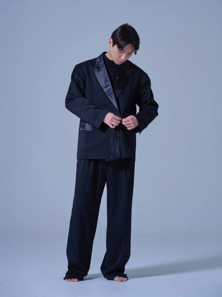 고급스러운 모본단 실크 한복원단으로 빅 사이즈 피크트 라펠을 제작하여 동양적인 포멀함이 큰 특징인 실크 한복 오버사이즈 수트 SET UP입니다.