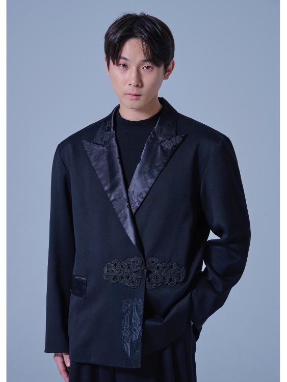 고급스러운 모본단 실크 한복원단으로 빅 사이즈 피크트 라펠을 제작하여 동양적인 포멀함이 큰 특징인 실크 한복 오버사이즈 블레이져입니다.